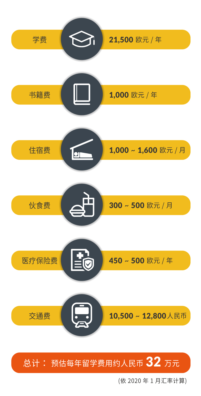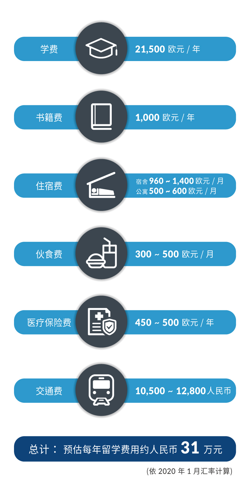 *以上费用仅供参考,实际金额以当时及个人状况不同而异,学费依当年度学校公告为主。