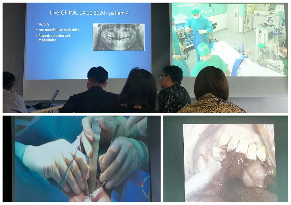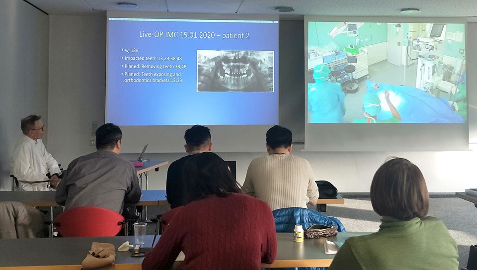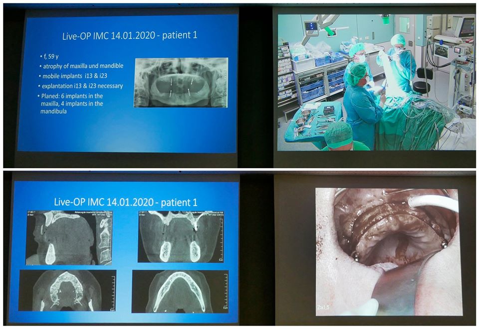 两天的课程中,分别由德国埃森米特医院种植牙中心主任Prof. Dr. med. dent. Thomas Weischer 、德国埃森米特医院颅颚面外科主任Univ.-Prof. Dr. Dr. Christopher Mohr 及 Dr. Moritz 轮流主刀植体种植手术,学员以 Live OP 方式于教室观摩,包含不同病例的种植牙手术:全口无牙及上颚萎缩患者种植牙、长囊肿患者之拔牙及囊肿移除、下颚双侧长骨疣患者之磨除、上下颚种植牙后植体失去固定牙龈的患者种植牙等。