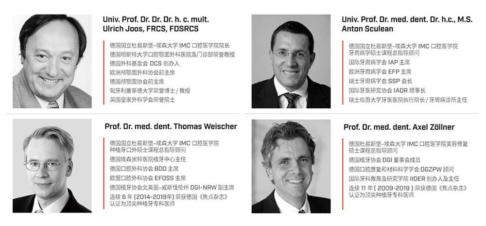 德国国立杜伊斯堡‒埃森大学 IMC 口腔医学院院长 Univ. Prof. Dr. Dr. Dr. h.c. mult. Ulrich Joos, FRCS, FDSRCS 自身即为德国明斯特大学口腔颚面外科医院及门诊部荣誉教授,同时身为德国外科基金会的创办人, Univ. Prof. Ulrich Joos 在全球口腔医学领域享誉盛名、备受尊崇,拥有极大的影响力。